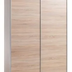 Konstfanér. Med skjutdörrar. Garderobsinredning: 2 hyllor och 2 klädstänger. B151 x H219 x D60 cm