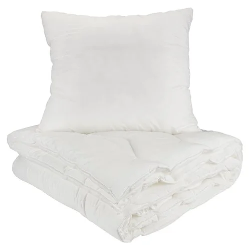 Set med fibertäcke och kudde. Luftig, isolerande fyllning av silikoniserad, spiralformad hålfiber (100% återvunnen), 990/460 g. Kuddens höjd kan justeras genom att ta bort en del av fyllningen. Mjuka överdrag i 100% polyestermikrofiber. Tvätt 60°C. Inkl. förvaringsväska. Täcke 150×200 cm. Kudde 50×60 cm.